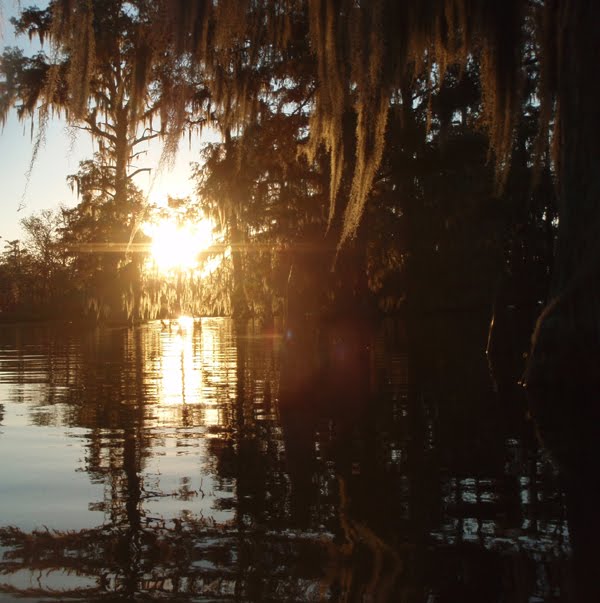 As we made our way through the trees, the sun began to set. We turned our bow towards the sinking golden orange orb dropping over the other edge of the lake. Now completely relaxed and absorbed in the experience, we paddled across the open water straight towards the setting sun.