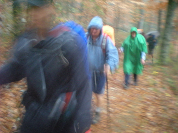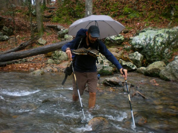 Hiking in raingear in warm humid weather is a challenge. For this I recommend an Umbrella. The umbrella can be affixed to your pack strap easily allowing your hands to be free for trekking poles. Click here to view how to set this up. If you like to take it to the extreme in lightness try a rain kilt instead of pants. Not only are they more ventilated and cooler – but you look at least 30% more tough (or maybe goofy).
