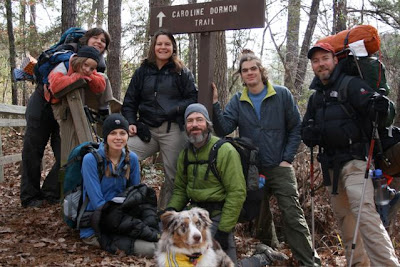 On New Years Day, Becky and I along with our son Matt and his wife Rebecca met our friends Mark and Jennifer Menou and their daughter Ruthie to head up to Kisatchie for a 3 day backpacking trip. We had planned to hike the Backbone and the Caroline Dormon trail as a single thru-hike of these interconnected trail. When we arrived at the trailhead, the cold front was blowing through and we all bundled up to head out. Ruthie led us down the trail with their dog, Ginger in tow.