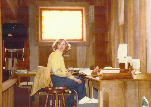 This window was in an area of the shop that was originally the office in the late 70’s.  This photo shows my mom sitting at her desk probably the first or second year we were open at this location.  Notice behind her (sorry it’s a little washed out) is the window that we reclaimed and made the centerpiece of our new window.  In talking to my dad about the leaded panes, he told me that those were panes taken out of my great grandmothers house during the depression in Bridgeport, Connecticut.